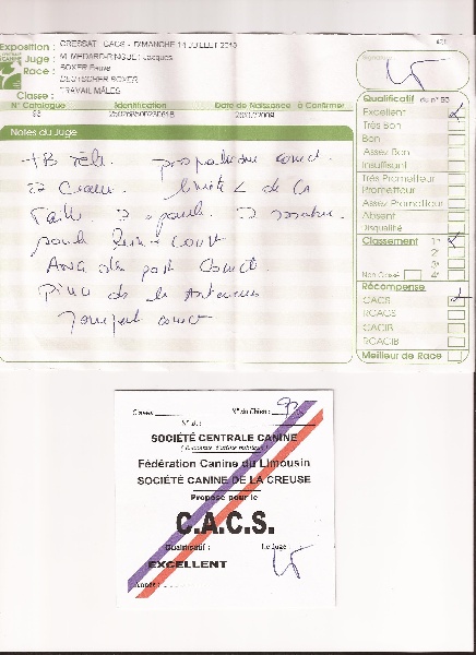 16 mois 1/2. Puissant avec bonne ossature. Angulations avant- arrière un peu juste. La ligne de dos est légèrement voûtée. Poitrine bien dessinée, qui doit prendre de la substance. Encolure puissante, mais un peu chargée. Jolie tête avec excellent volume de museau. Excellents yeux, mais l'excès de rides modifie un peu l'expression. Denture pourrait être plus large. Aux allures : serre un peu à l'arrière.